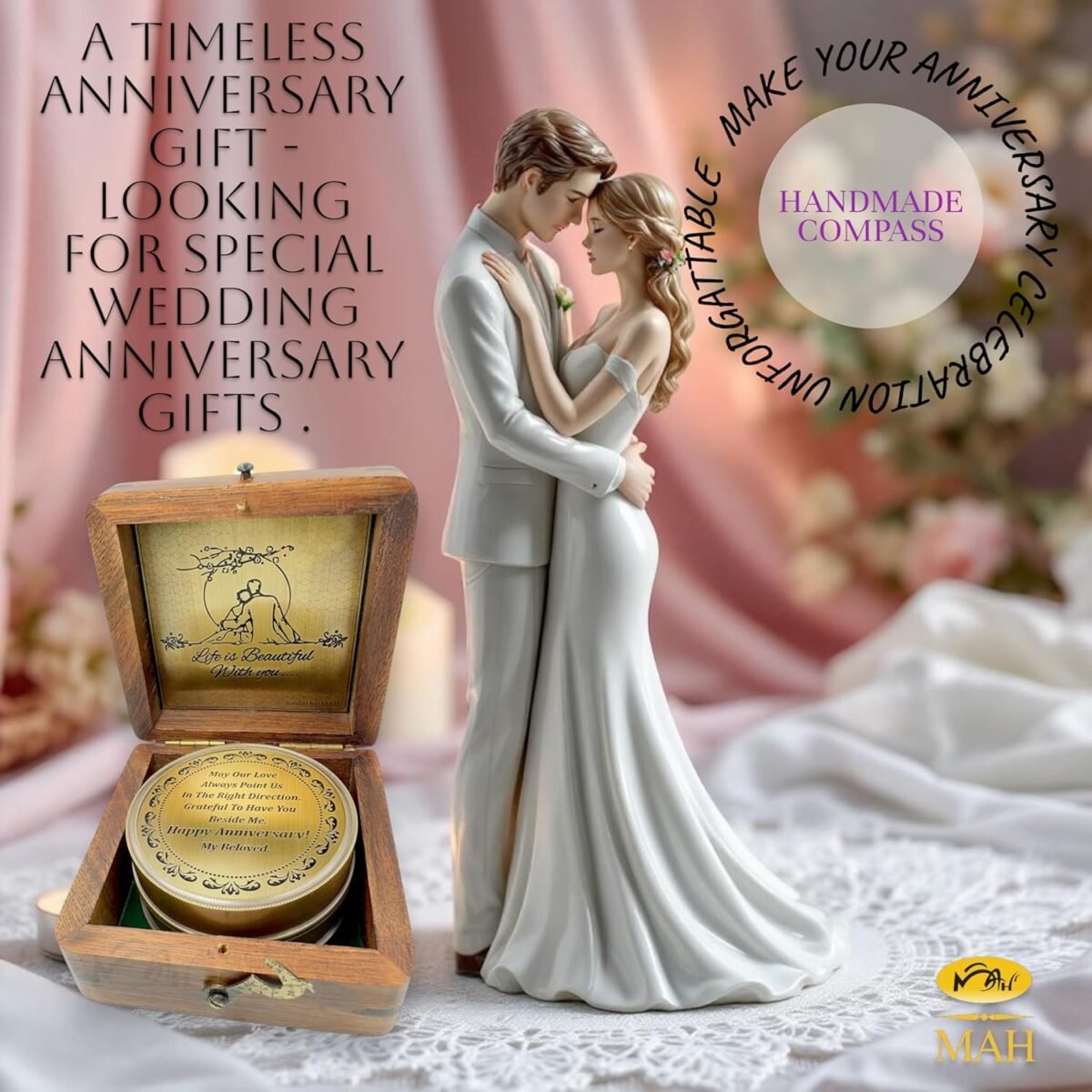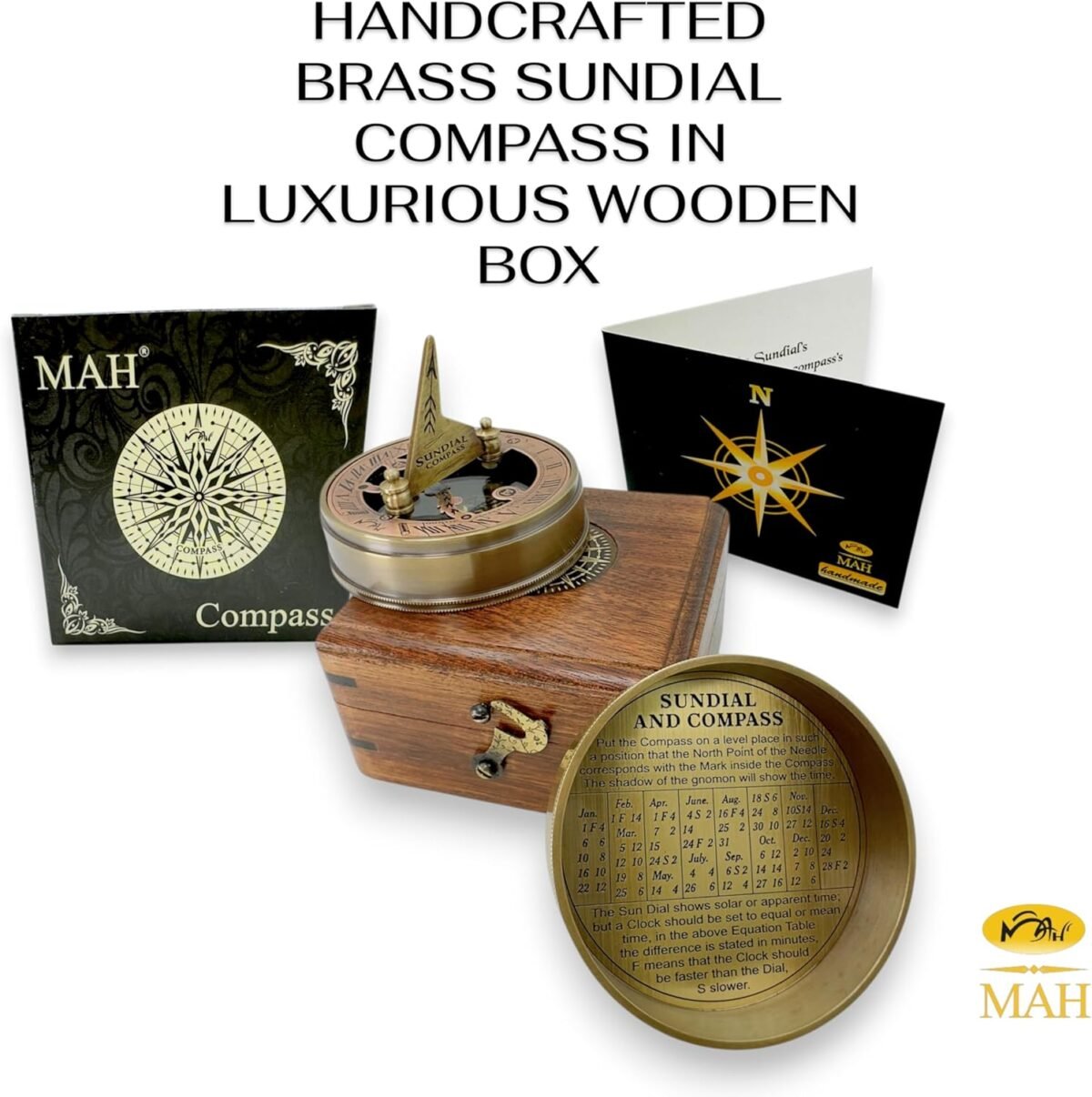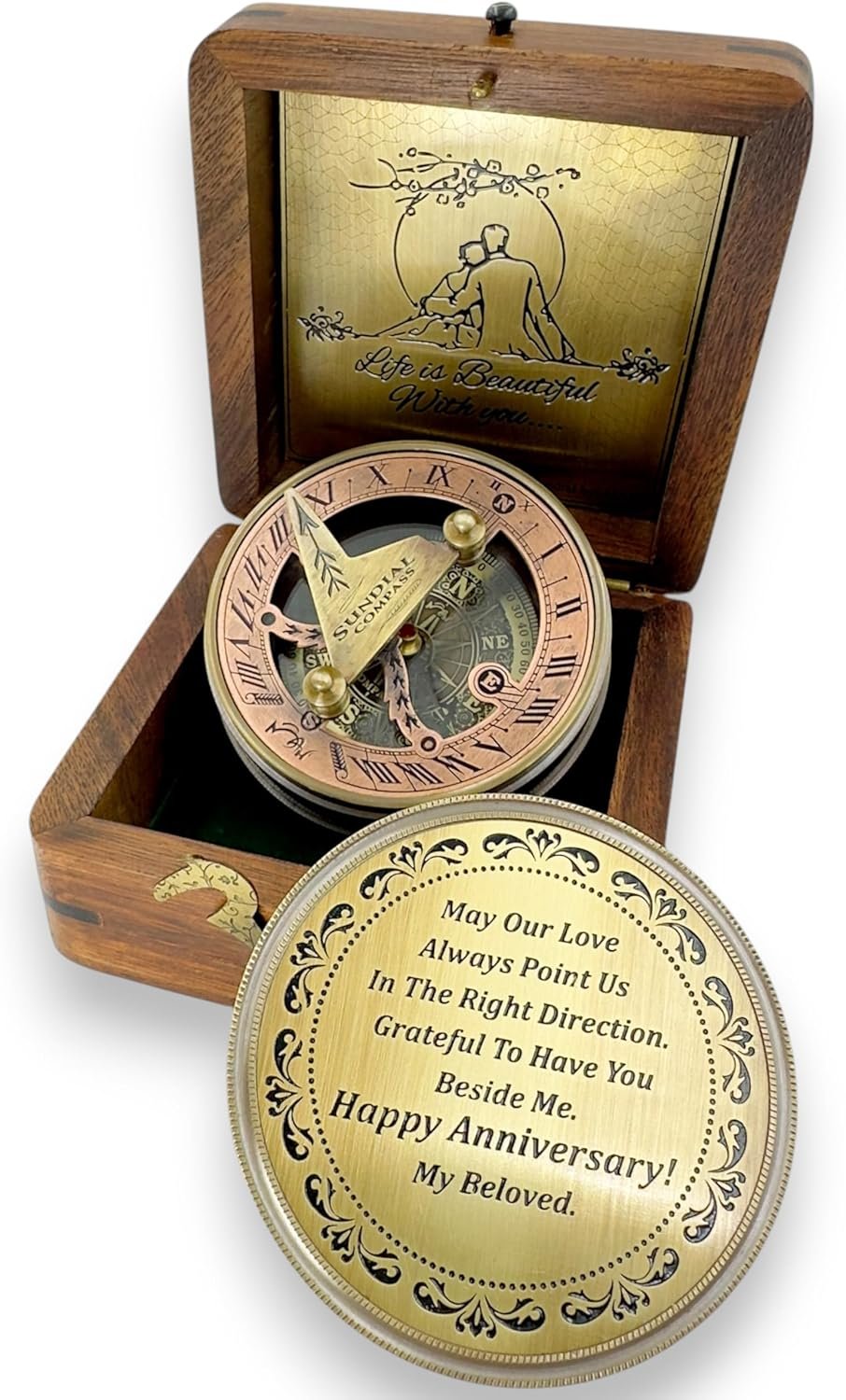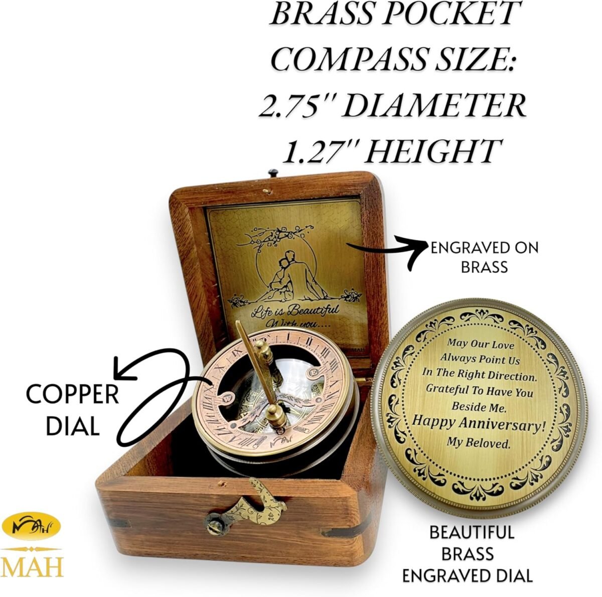 Celebrate Your Love with a Timeless Sundial Compass Gift This handcrafted brass sundial compass is more than a decorative keepsake — it’s a heartfelt symbol of love, time, and lasting connection. Whether your selected variation features a romantic quote or a vintage chart dial, each piece tells a story — of journeys shared, milestones celebrated, and memories treasured. Expertly crafted from antique-finished brass with Roman numerals engraved around the sundial, this symbolic piece is presented in an elegant wooden box (design varies by style). It also includes a premium greeting card inside, making it instantly gift-ready. Perfect for a 1st, 10th, 25th, or 50th wedding anniversary — or any romantic occasion — this compass is designed to endure just like your love: strong, timeless, and deeply meaningful.