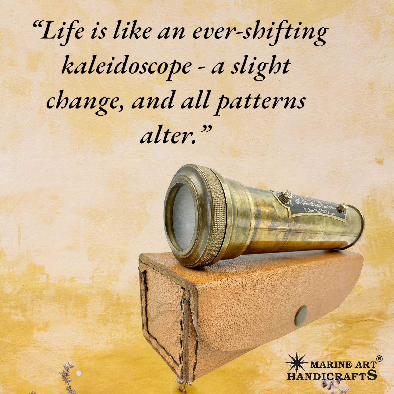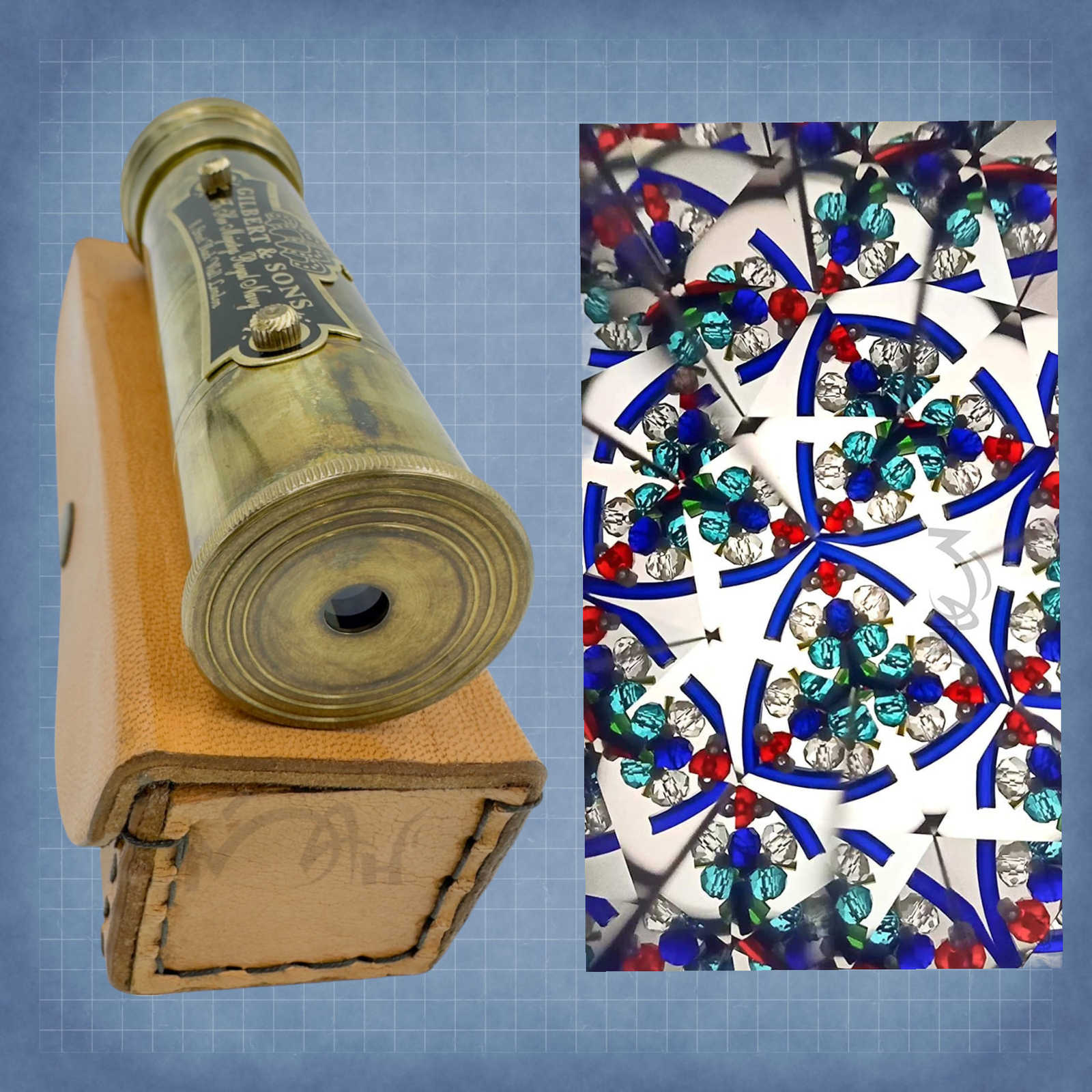 BRAND-MAH This multi-colored handmade kaleidoscope will keep your kids intrigued and stimulated and designed with safety and durability. A kaleidoscope is an optical instrument consisting of three reflecting mirrors that are tilted toward each other to obtain symmetrical patterns of colorful beams when viewed from the other end. Good Piece of Collection and Best For Gift. Useful in Entertainment. Size Approx.: 13.5 cm Tall x 3.7 cm Dia (Kaleidoscope) 14.5 cm Length x 4.5 cm Wide x 4.5cm Height (Leather Box)