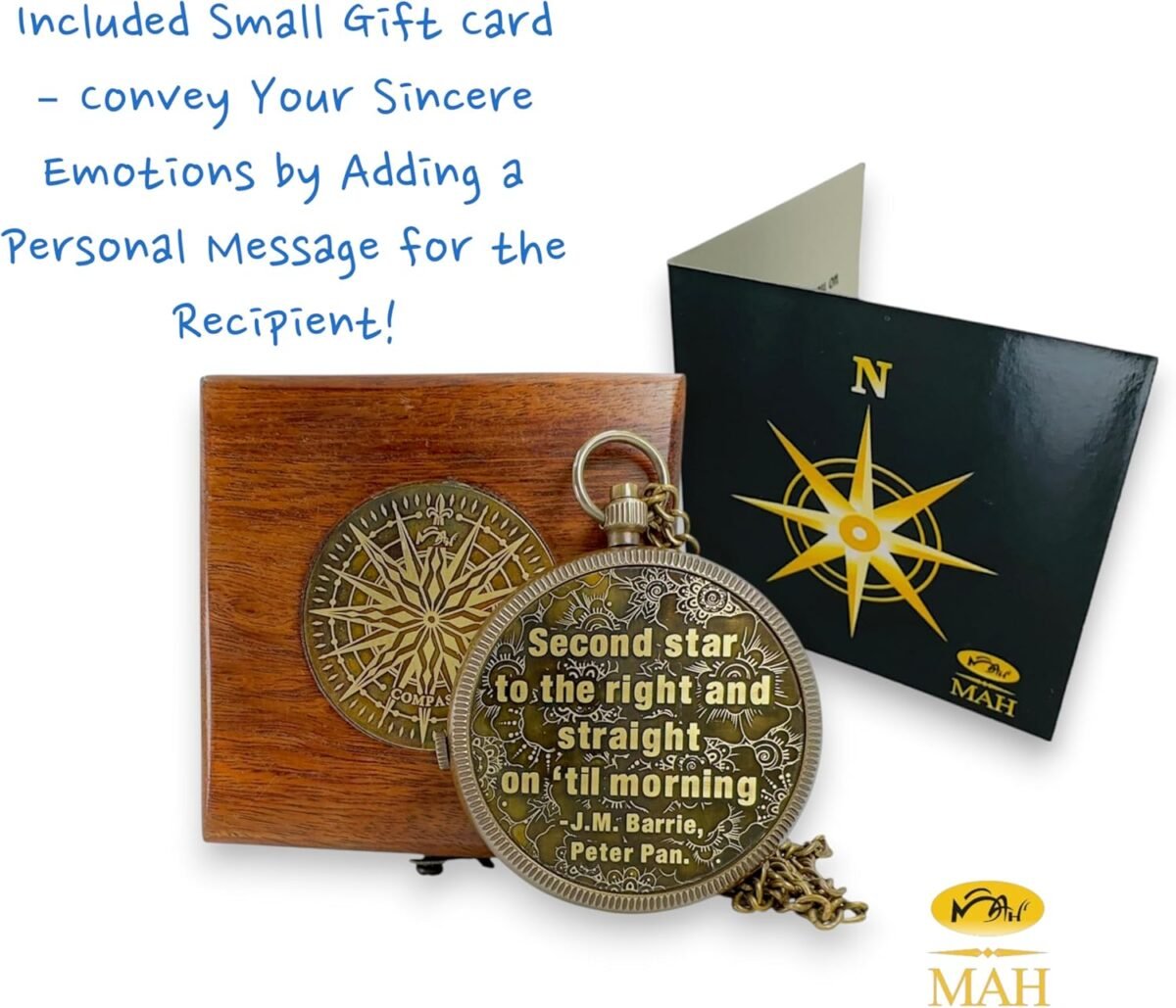“Second star to the right and straight on ’til morning” – a quote that captures the magic of dreams, adventure, and love that guides us no matter where life leads. This antique brass compass, featuring a beautifully embossed dial, is a heartfelt keepsake designed to inspire. Whether it’s gifted for a graduation, birthday, or a new beginning, this compass is more than a navigational tool — it’s a symbol of support, imagination, and the courage to chase one’s path. Every detail, from its compact design to its vintage finish, makes it a treasured item for sons, daughters, best friends, or anyone you care about. Choose from elegant gift-ready packaging options to suit any occasion. With its timeless design and meaningful message, this compass is a reminder to follow your dreams — and always stay true to your direction.