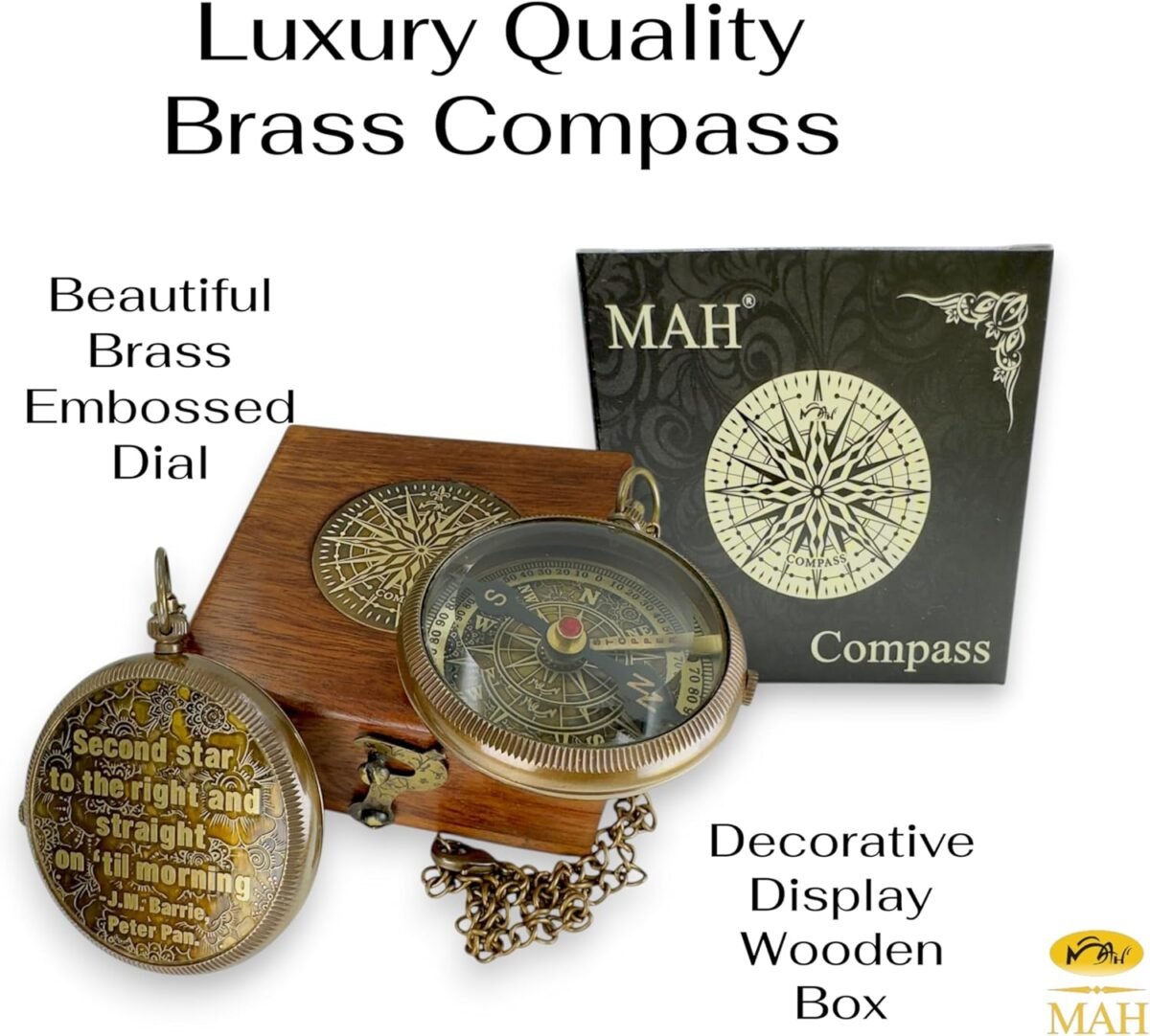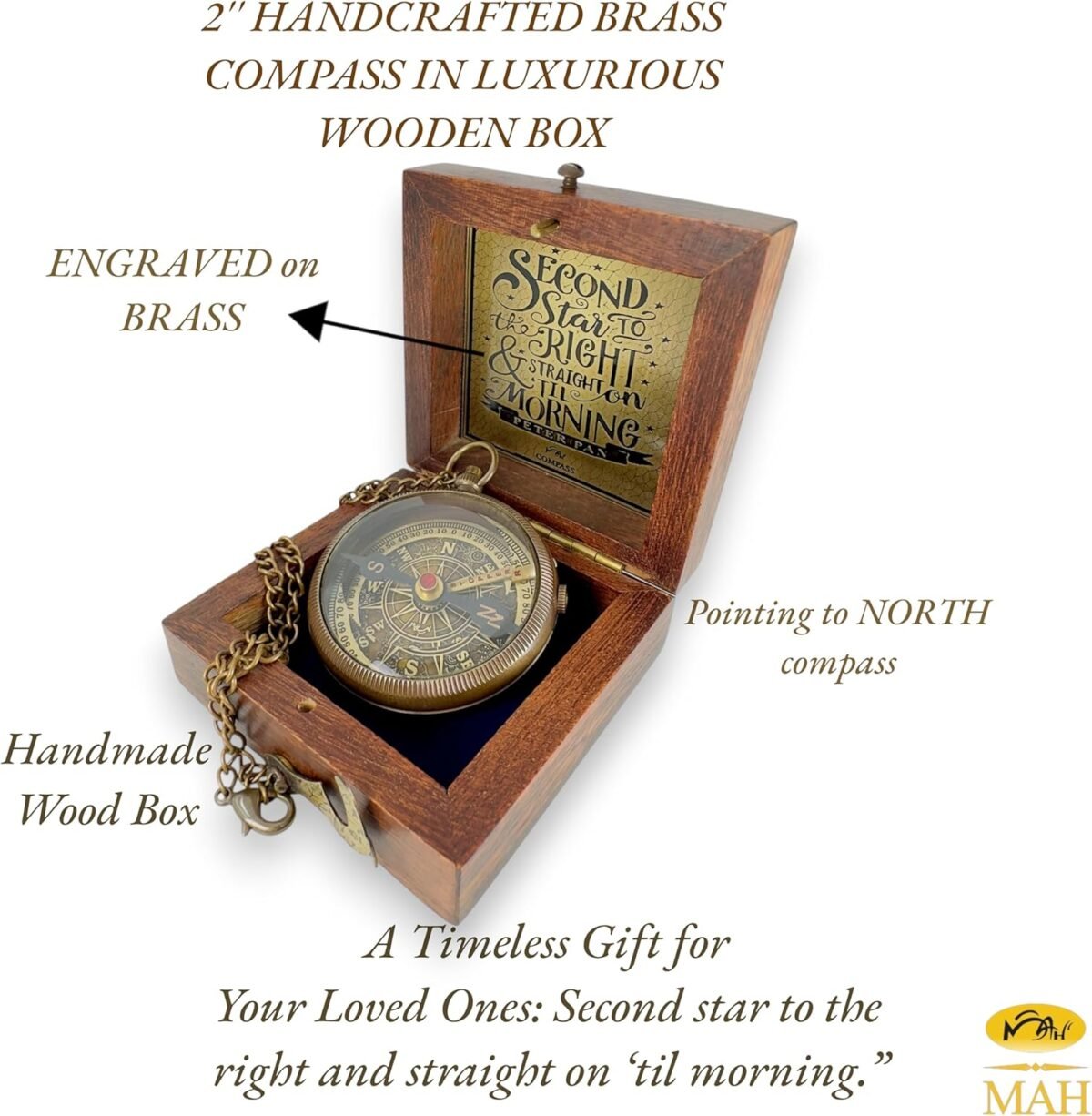 Brass Compass with “Second Star to the Right” Embossed Dial – Inspirational Pocket Compass Gift for Son, Daughter, or Friend | Motivational Keepsake for Graduation, Birthday, Christmas, or Travel gift