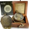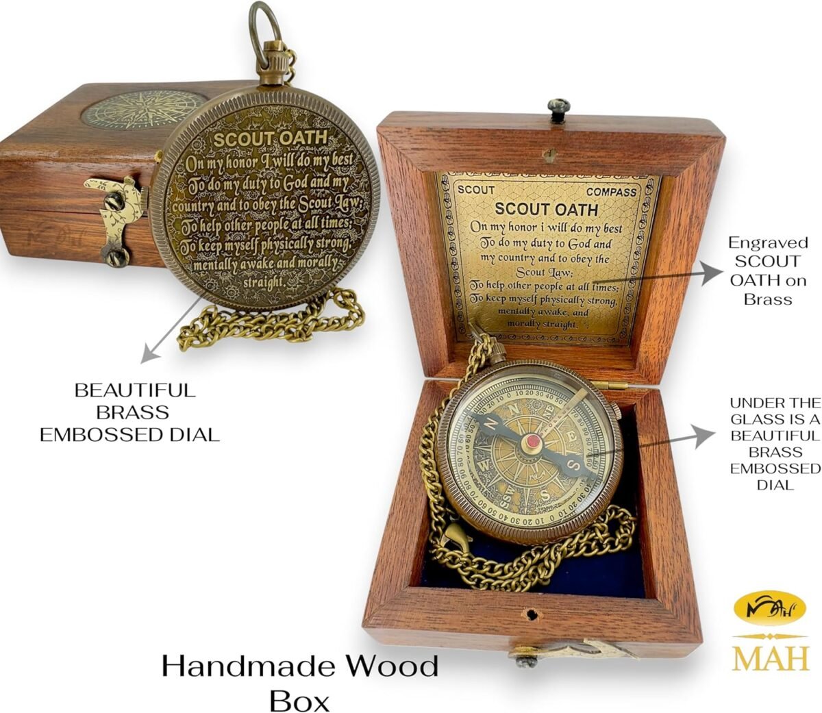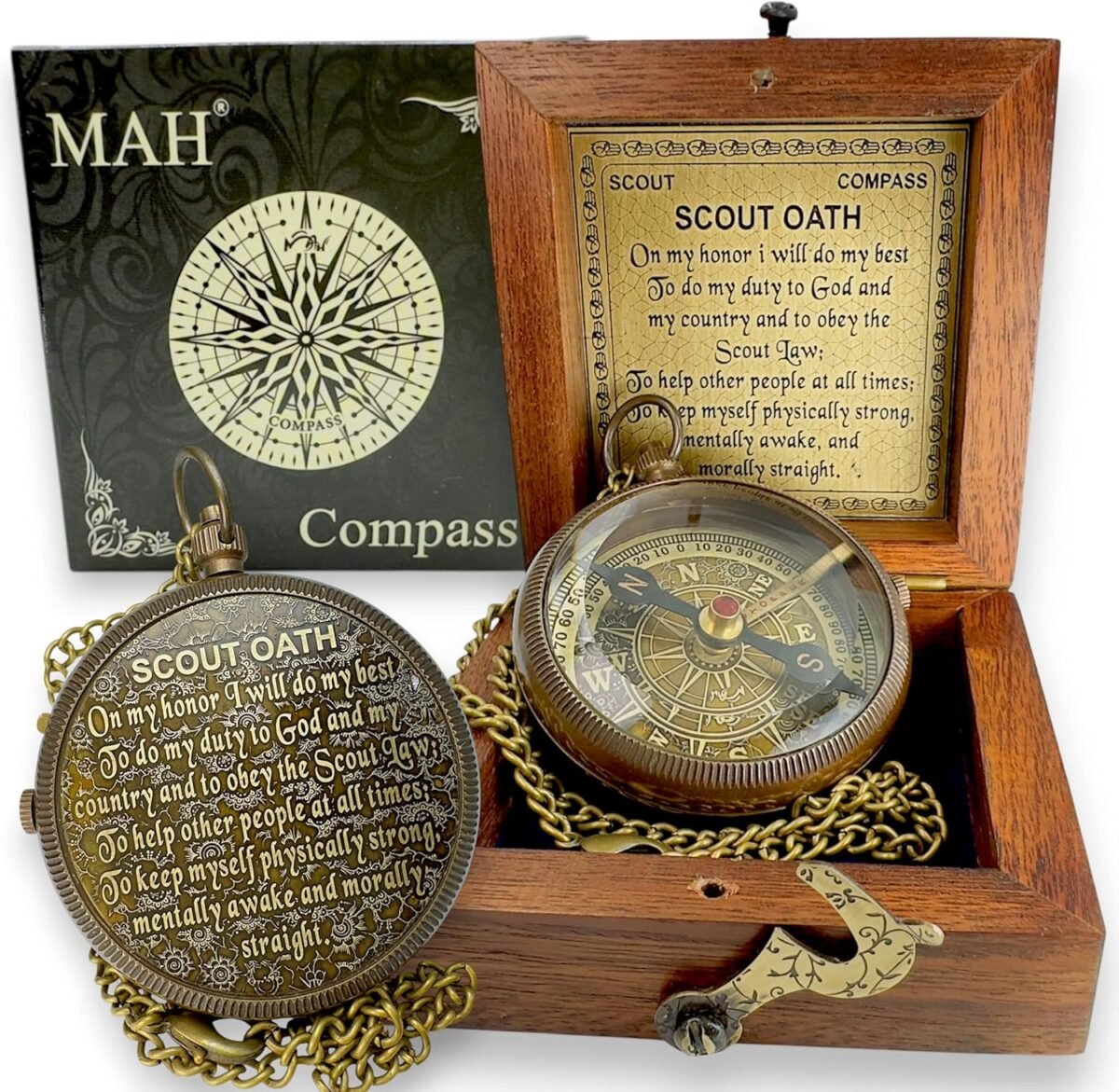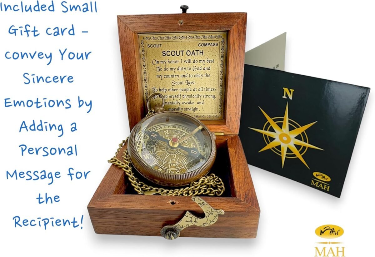 This handcrafted brass compass carries the full Scout Oath—a lifelong reminder of honor, duty, and purpose. A meaningful gift for boys, teens, and scouts stepping into new chapters of life. Presented in a finely crafted wooden box, this edition includes a mounted brass oath plaque inside the lid and a compass dial emblem on top—making it a timeless keepsake for display or gifting. Whether placed on a desk, shelf, or given at a milestone event, it honors the values of service and strength. Built with a detailed brass dial under beveled glass and a functional needle stopper, it also includes a gift card for your personal message. Perfect for Eagle Scout ceremonies, graduations, or memorial gifting. Let them carry the spirit of scouting wherever life leads.