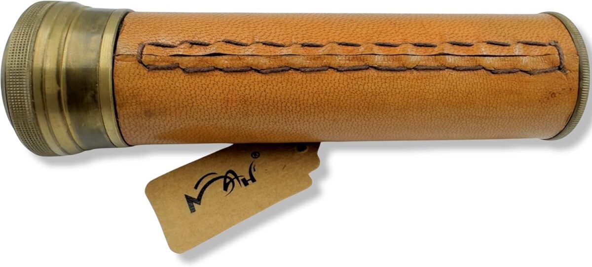 Step into a world of timeless craftsmanship with this handcrafted brass kaleidoscope, designed to reflect the elegance and charm of London’s vintage instrument makers. Wrapped in soft tan leather and adorned with a Gilbert & Sons – London brass nameplate, this piece pays tribute to a celebrated era of exploration, artistry, and discovery. Each kaleidoscope is carefully handcrafted by skilled artisans and polished to a warm antique finish. As you gently rotate the front ring and gaze through the lens, dazzling symmetrical patterns come alive — a magical experience for both children and adults. This edition comes with a solid brass display stand, allowing you to showcase it as a centerpiece on your desk, study shelf, or living room. The combination of brass and leather brings a rich, premium look that elevates any space. A greeting card is included so you can add your personal message, making it a thoughtful gift for birthdays, anniversaries, holidays, or special milestones. Whether displayed as a collectible or kept as part of your personal treasury, this kaleidoscope is a beautiful reminder of vintage artistry and classic design.