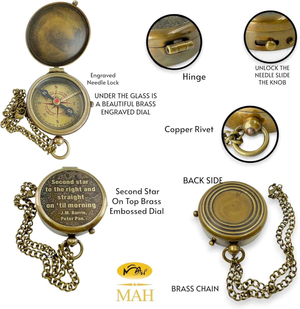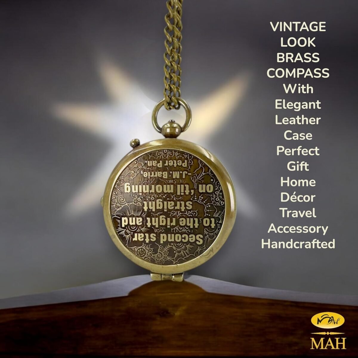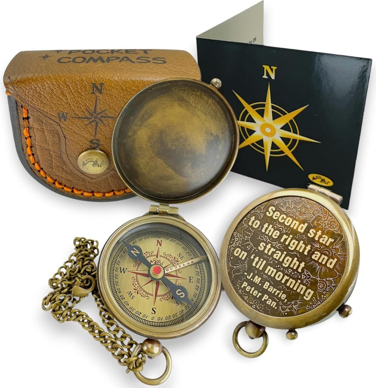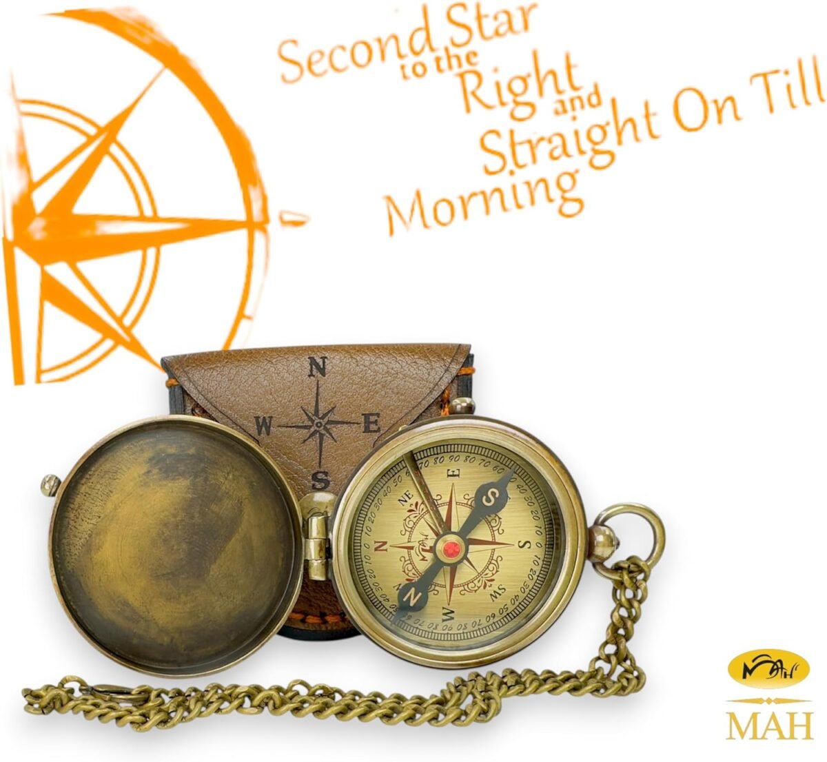 Brass Compass with “Second Star to the Right” Embossed Dial – Inspirational Pocket Compass Gift for Son, Daughter, or Friend | Motivational Keepsake for Graduation, Birthday, Christmas, or Travel gift