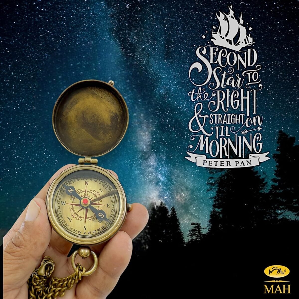 “Second star to the right and straight on ’til morning” – a quote that captures the magic of dreams, adventure, and love that guides us no matter where life leads. This antique brass compass, featuring a beautifully embossed dial, is a heartfelt keepsake designed to inspire. Whether it’s gifted for a graduation, birthday, or a new beginning, this compass is more than a navigational tool — it’s a symbol of support, imagination, and the courage to chase one’s path. Every detail, from its compact design to its vintage finish, makes it a treasured item for sons, daughters, best friends, or anyone you care about. Choose from elegant gift-ready packaging options to suit any occasion. With its timeless design and meaningful message, this compass is a reminder to follow your dreams — and always stay true to your direction.