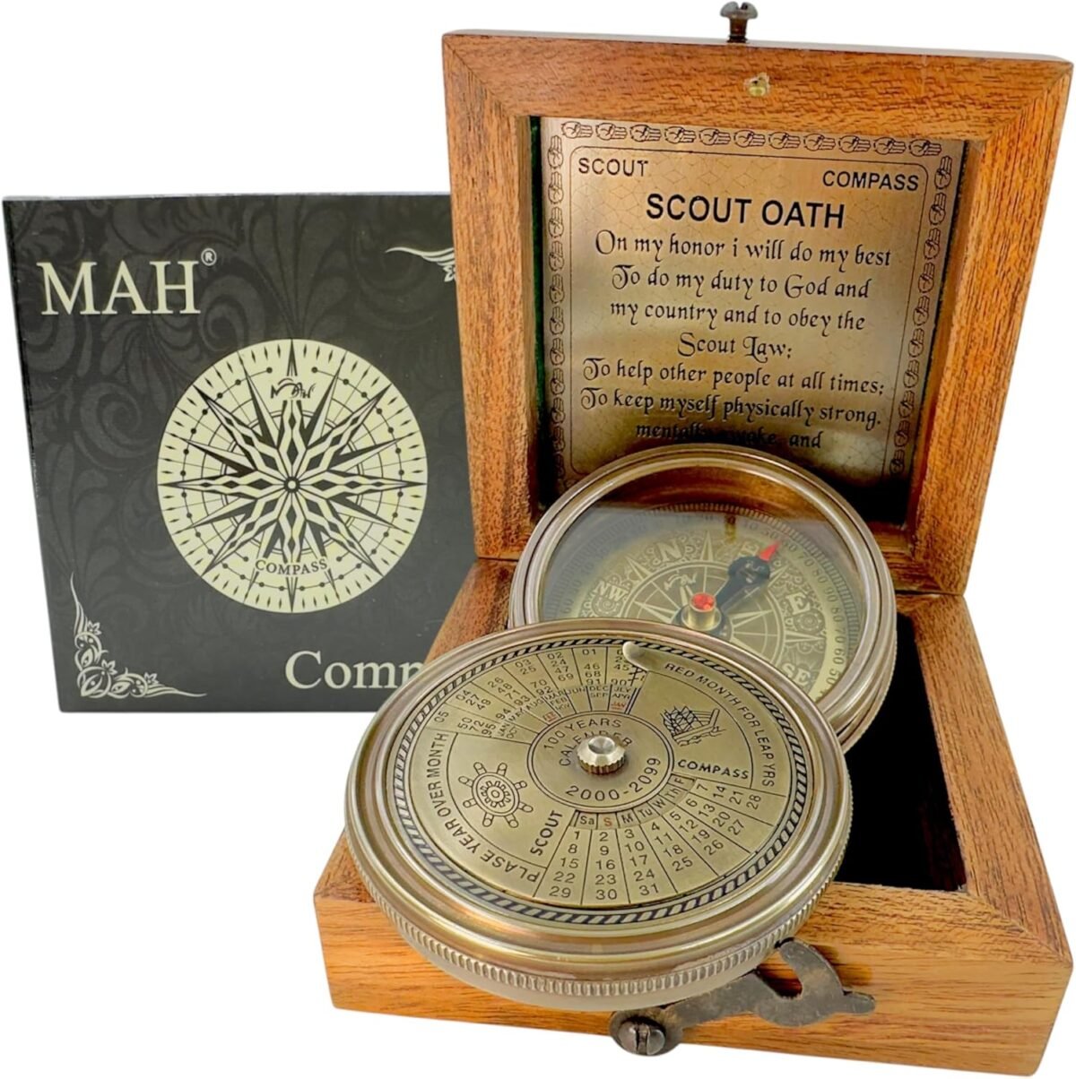 This handcrafted brass compass is more than just a navigation tool—it’s a time-honoring keepsake for those who live by the Scout Oath. The dial includes a 100-year calendar (2000–2099), historically used to calculate weekdays, leap years, and align planning for future events—just like scouts prepare ahead. It’s a nod to the wisdom of planning and the passage of time. The full Scout Oath is beautifully embossed on the compass lid, while the inside of the wooden keepsake box features a mounted brass plaque with the same Oath engraved—making this a meaningful piece for display and direction. With a functional needle stopper, beveled glass dial, and included message card for your personal note, it’s the perfect gift for Eagle ceremonies, scout promotions, or milestone moments. This edition helps scouts track time, hold values, and never lose their way.