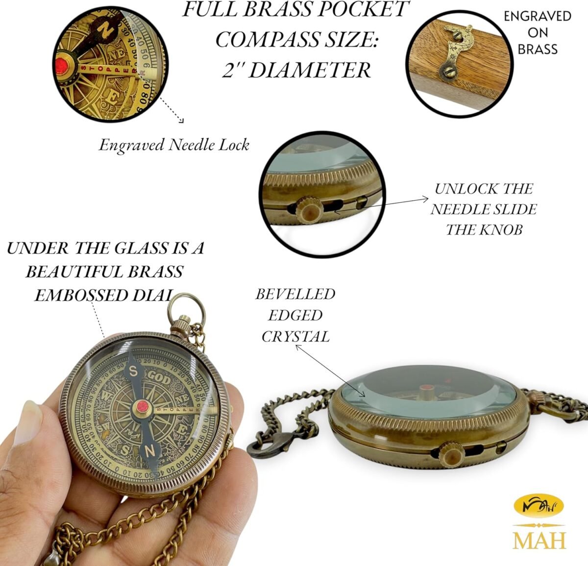 Give your son a timeless reminder of love, faith, and direction with this handcrafted brass pocket compass. Beautifully designed with intricate embossing on the inside dial and back, it carries a heartfelt “To My Son” message — a symbol of strength, guidance, and unwavering support from parents. Each compass is made from premium solid brass with a smooth antique finish, creating a classic heirloom look. It features a unique engraved stopper system with a needle lock mechanism to keep the needle secure, ensuring safe handling, accurate direction, and long-term durability. The compass arrives in a handcrafted wooden keepsake box with an engraved brass plaque and a protective chain, making it ideal for graduation, birthdays, Christmas, or any special life milestone. A personal greeting card is also included so you can add your own heartfelt message, turning a beautiful gift into a lasting memory. Whether it’s a parent’s blessing, a graduation token, or a message to stay strong through life’s journey, this compass is more than a gift — it’s a symbol of love, direction, and legacy.