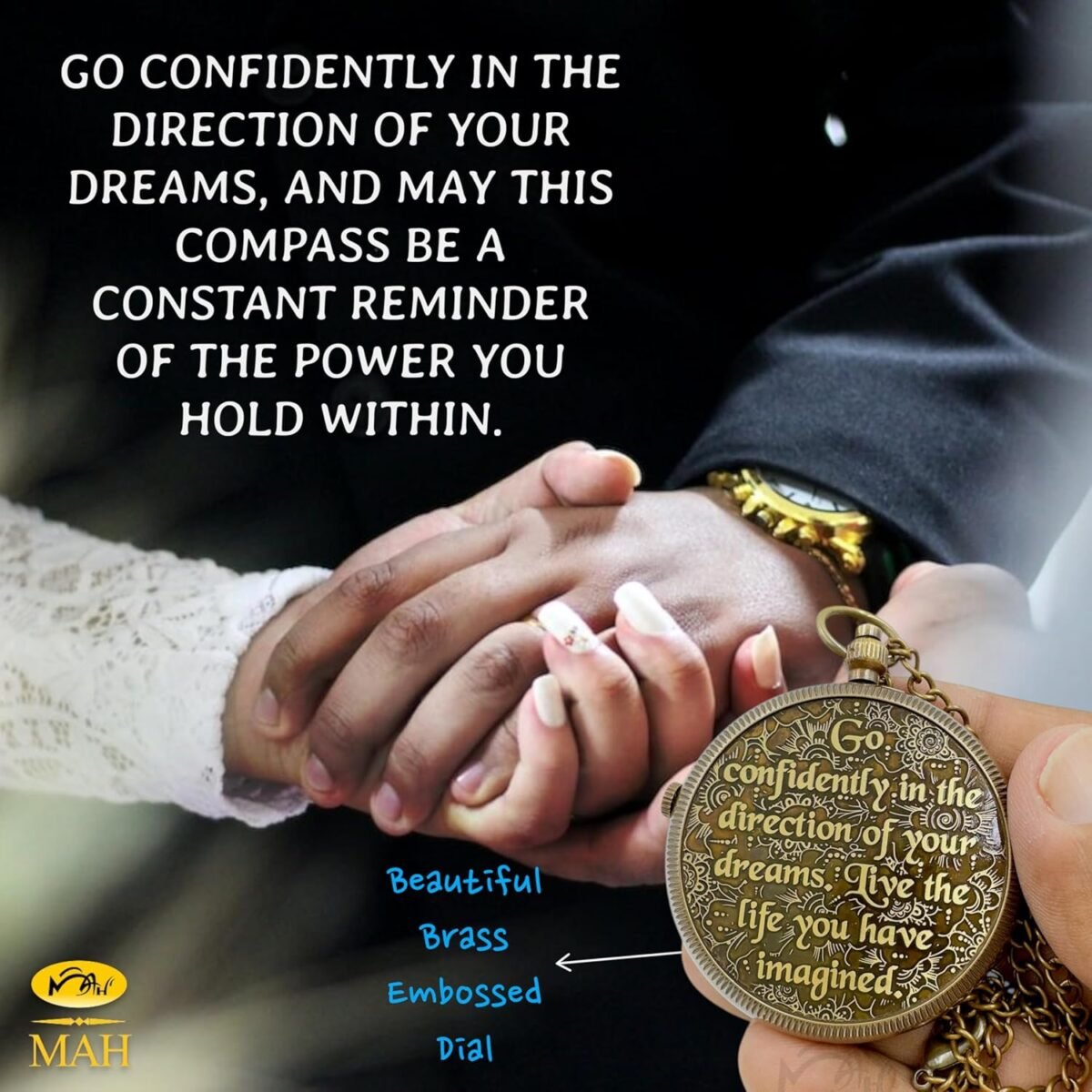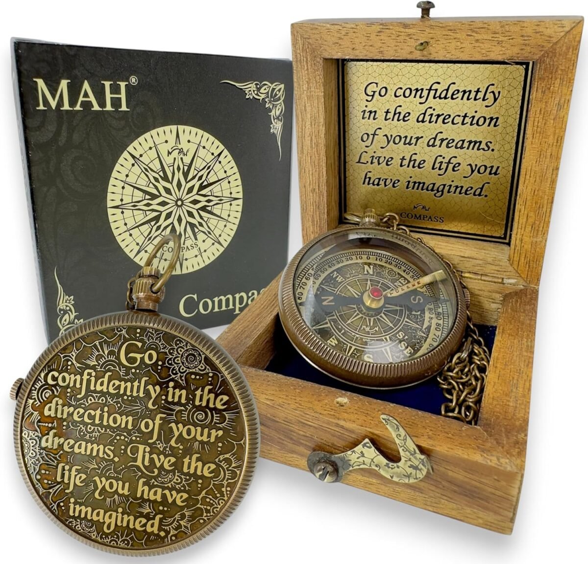 Mark life’s greatest milestones with a keepsake that inspires confidence and courage. This handcrafted brass compass is more than a navigation tool—it’s a symbol of direction and dreams fulfilled. The lid is beautifully embossed with Henry David Thoreau’s enduring words: “Go Confidently in the Direction of Your Dreams. Live the Life You Have Imagined.” Made from solid brass with a beveled glass dial and engraved needle lock, this compass is built with care and craftsmanship. Its attached brass chain allows it to be carried or displayed like a classic pocket watch—combining vintage elegance with practical design. Presented in a finely crafted wooden gift box and paired with a small greeting card for your personal note, it’s ready to give as a meaningful graduation gift, confirmation keepsake, birthday present, or token of encouragement. Whether gifted to a student, child, mentor, or dreamer, this compass is a timeless reminder to follow one’s true north and embrace every new beginning with confidence.